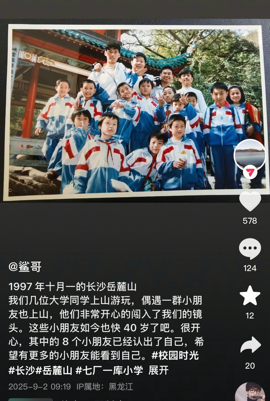 “1997年十月一的长沙岳麓山。我们几位大学同学上山游玩,偶遇一群小朋友也上山,他们非常开心地闯入了我们的镜头。这些小朋友如今也快40岁了吧。”2025年9月2日,黑龙江的牟武军在网上发布了这张老照片。